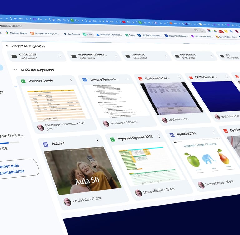 Deja de buscar archivos y comienza a encontrarlos al instante. Este taller te enseña a manejar Google Drive para organizar y guardar documentos en la nube, liberando espacio de tu computadora. Aprenderás a usar Google Docs para crear cartas o recetas de forma sencilla y, lo más importante, a compartir y colaborar de forma segura con familiares o instituciones. Finalizarás el curso sabiendo crear presentaciones sencillas con Google Diapositivas.