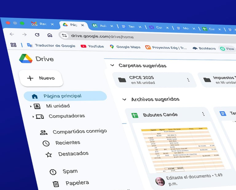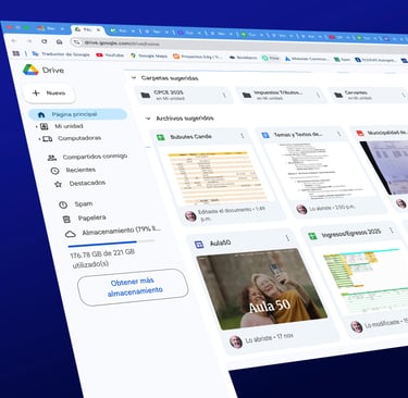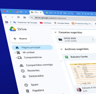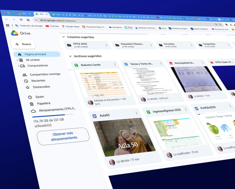 Deja de buscar archivos y comienza a encontrarlos al instante. Este taller te enseña a manejar Google Drive para organizar y guardar documentos en la nube, liberando espacio de tu computadora. Aprenderás a usar Google Docs para crear cartas o recetas de forma sencilla y, lo más importante, a compartir y colaborar de forma segura con familiares o instituciones. Finalizarás el curso sabiendo crear presentaciones sencillas con Google Diapositivas.